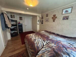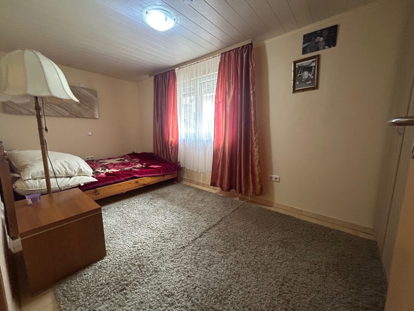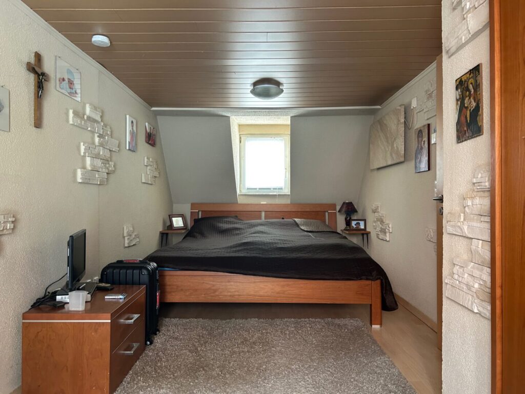 Im Obergeschoss erwarten Sie ein Wannenbad mit Tageslicht, ein Schlafzimmer sowie zwei weitere Zimmer, eines davon als Durchgangszimmer. Das Obergeschoss wird mit einer elektrischen Plattenheizung beheizt. Von einem der Räume aus haben Sie Zugang zur großzügigen Dachterrasse, ideal für sonnige Nachmittage oder entspannte Abende.